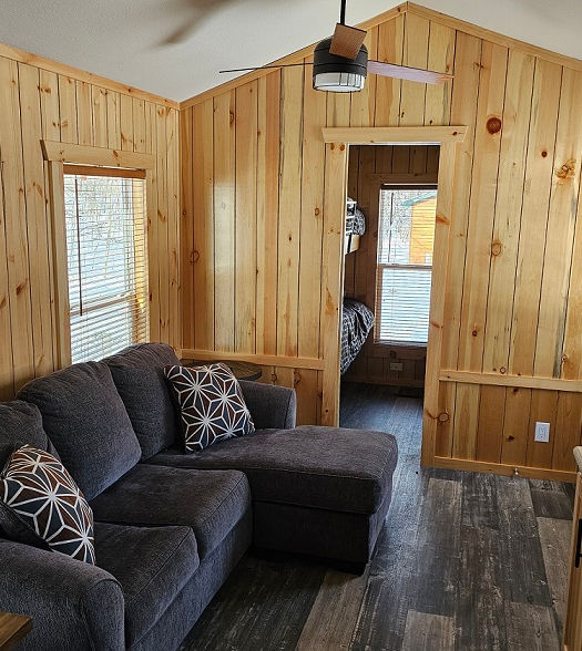 This is a two-bedroom park model unit featuring a master bedroom with a queen size bed, second bedroom with double bunk beds, a full bathroom with a tub/shower combo, a full kitchen, as well as a sleeper softa in the living room. There is an attached deck for sitting. A charcoal grill, picnic table & fire ring are included with this cabin.