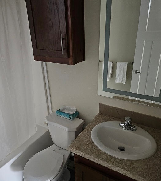 This 2 bedroom park model features a master bedroom with a queen bed, second bedroom with a full lower and twin upper bunk bed, a bathroom with tub & shower and a full kitchen. It also features a living area with entertainment system & a sleeper sofa. Attached deck, charcoal grill, picnic table & a fire ring are included with this unit.