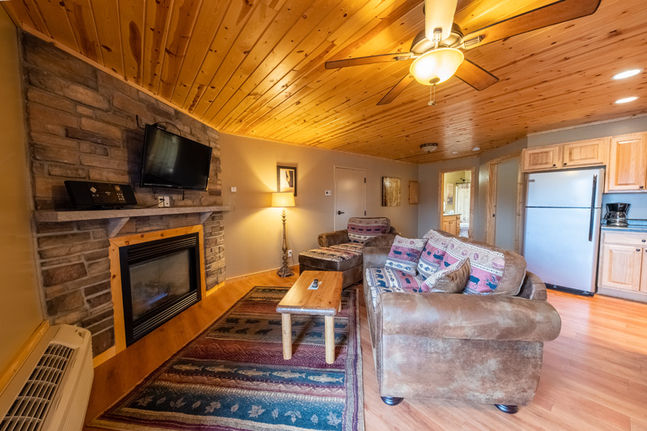 Our Honeymoon Suite, is perfect for a relaxing getaway and is located on the upper level of our main lodge. It features 1 bedroom with a queen size bed, complete with a jetted tub. This unit has a full kitchen, full bathroom, gas fireplace in the living room, and a private patio area with lounge chairs to enjoy the beautiful sunset views over Lake Mille Lacs.