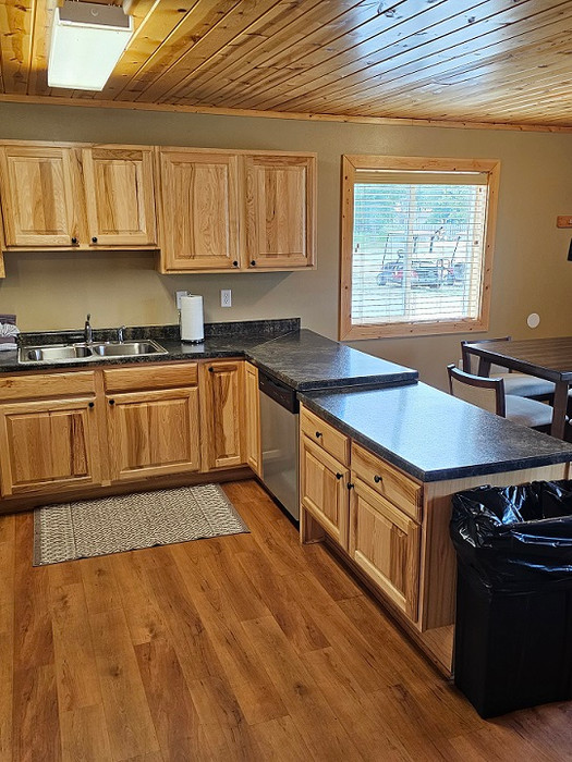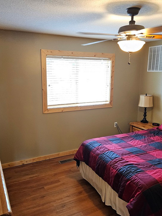 Our Lakeview Suite is a main level unit featuring 2 bedrooms with queen size beds, as well as a full-size futon in the living room. This unit has a full kitchen, a gas fireplace in the living room, as well as a patio area with picnic table & charcoal grill. Located right next to our main lodge and close to our Patio Restaurant & Bar, this unit is a popular rental option.