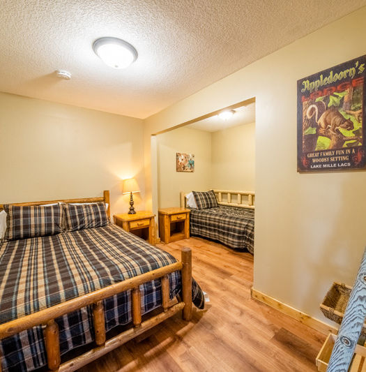 The 2 bedroom, 1 bath unit has 1 king bed, 1 queen, a day bed, and a full size futon in the living room. It also has a large full kitchen, bathroom and a gas fireplace.